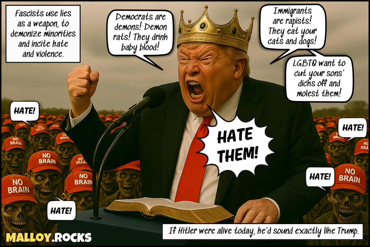 It's the same ideology of hate: Hatred of minorities, LGBT, non-Christians, immigrants, the disabled, and political opponents. MAGA is a fascist cult. They hate anyone who is different, and it will lead to bloodshed again if we don't stop Orange Hitler.